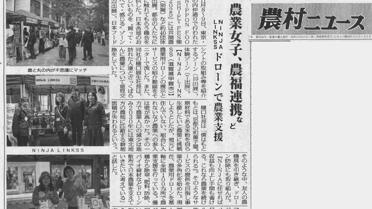 私たちについて Who we are 私たちについて  滋賀県の農機具販売から始まったNINJA LINKSSは、農家さんへのドローン販売をきっかけに、「代わりに散布してほしい」という依頼を受けた...