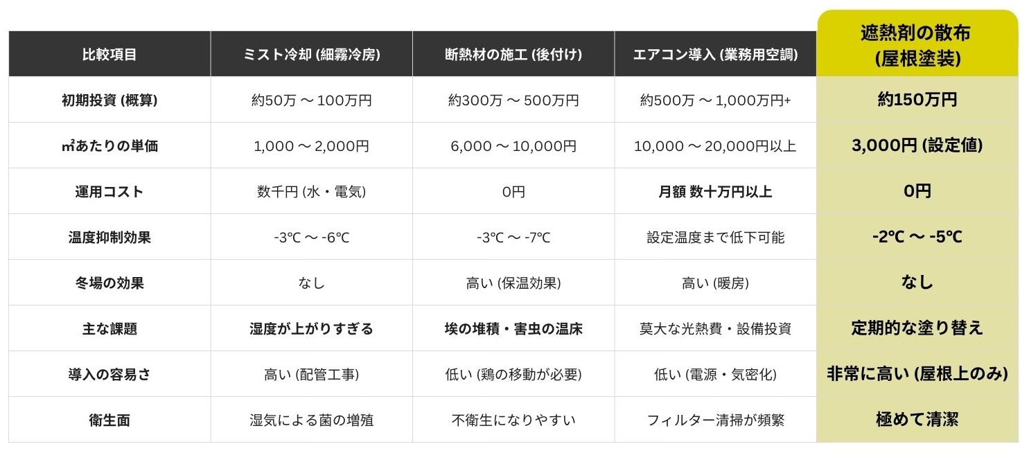 遮熱剤の散布は、畜舎建て替えや改修工事(密閉空間)及び設備投資(エアコン導入等)に比べて初期費用が抑えられるため、遮熱剤散布は農家にとって現実的な選択肢となっています。