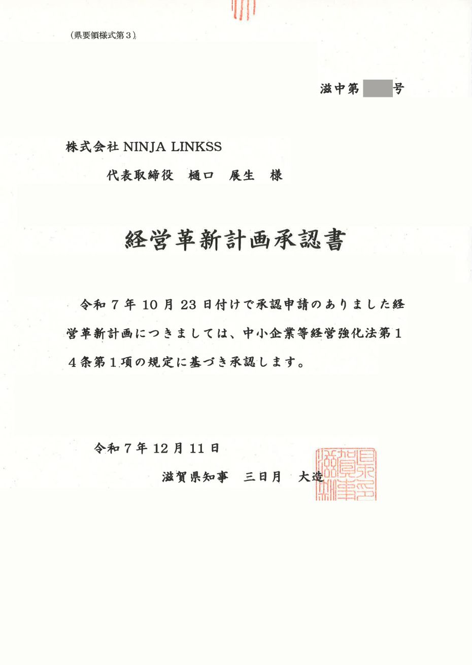 滋賀県より「経営革新計画」の認定を受けました|株式会社NINJA LINKSS