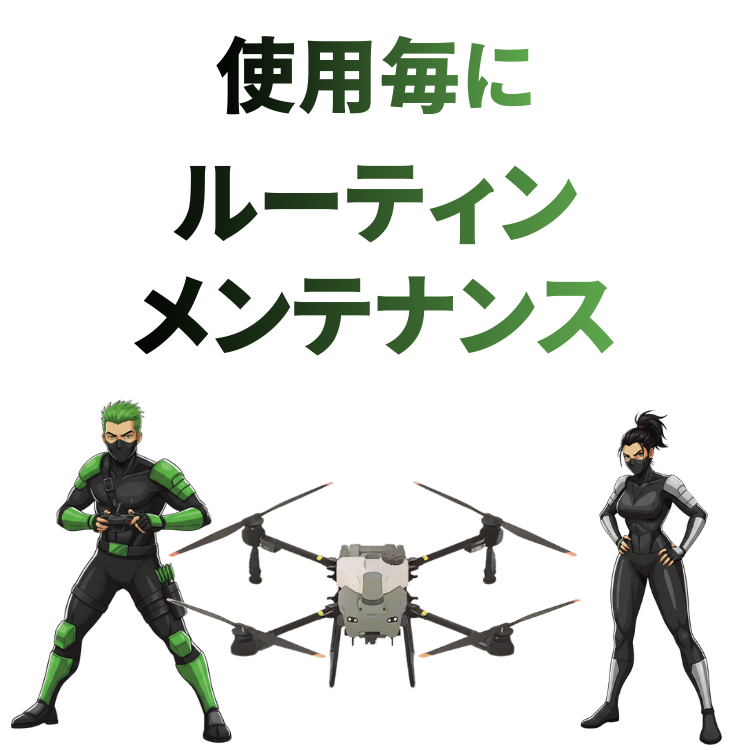 農薬散布後は下記ご参照いただき、機体及び散布装置のしっかりとしたメンテナンスを実施ください。メンテナンス不足により散布不能・機体の破損・墜落などをのリスクが高まりますのでしっかりと実施しましょう。
