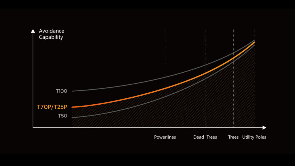 安全性システム3.0[2]は、T25Pが電柱や木を検出し、自信を持って障害物を回避できるようにします。ガイワイヤーのような低反射の障害物は、より安全な飛行を確保するために事前計画でマークする必要があります。